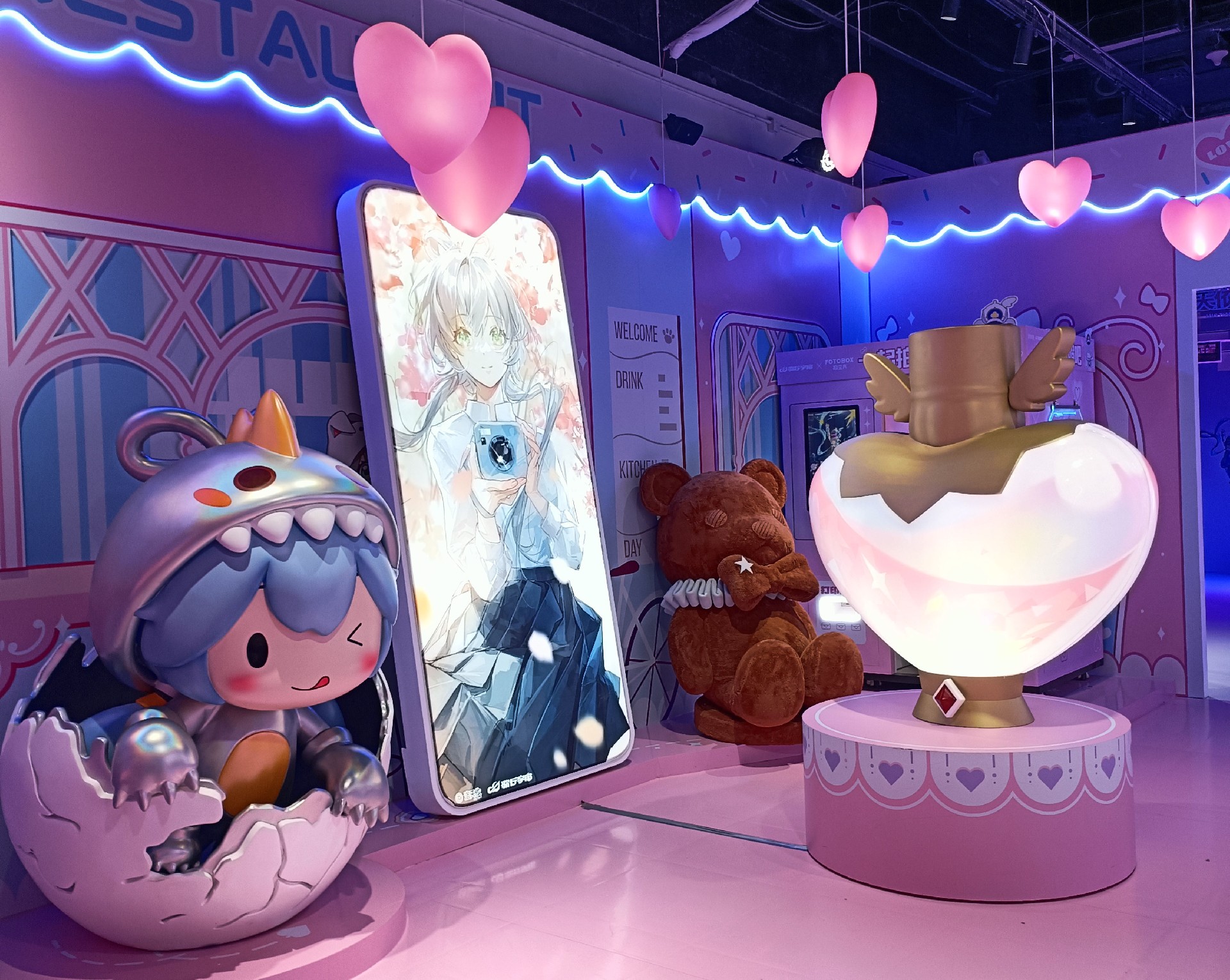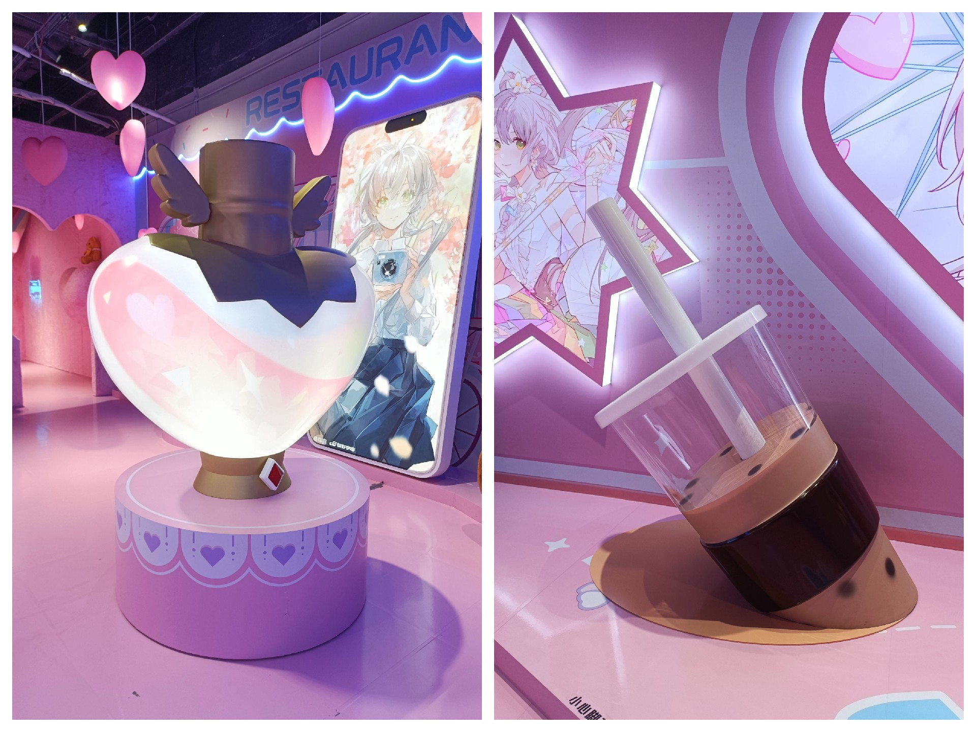 沉浸式展示道具用于產品的襯托和空間設計與環境的陳列搭配。今天分享一個應用案例,金秋上海月星環球港動漫歌手“洛天依沉浸式體驗展”中的兩個大型展示道具。一個是心形的吸塑造型,另一個是珍珠奶茶杯造型。這兩款道具采用了多種工藝和技術,逼真得還原了品牌的設計元素,制作流程如下: